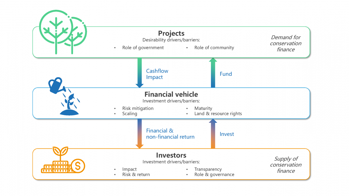 Figure 1 Risk layering and misalignment of priorities in conservation finance (adapted from Smith et al., 2022)However, the critical ingredient for successful blended finance transactions is the potential for viable revenue streams to pay back the return-seeking capital – highlighting the importance of developing sustainable business models for biodiversity conservation projects. One real-life example of this is tourism, which can be leveraged to finance protected areas by implementing models of nature-based tourism – already a successful approach in Botswana, India, Kenya, and South Africa, which has contributed to both economic growth and biodiversity conservation (Ben Jebli et al., 2019; Twining–Ward et al., 2018).