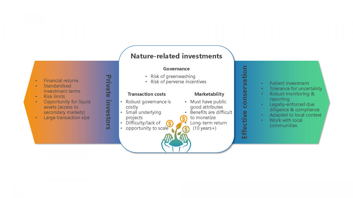 Figure 3 Antagonisms between conservation and financial investor outcomes (adapted from Kedward et al., 2023)Of course, public bodies play a pivotal role in biodiversity finance thanks to their impact through incentives and clear regulatory frameworks, together promoting transparency and accountability. Historically, oversight mechanisms have been driven by private sector initiatives, leading to conflicts of interest and instances of ‘greenwashing’ – which now demonstrates that a proactive oversight role for public bodies is needed to ensure robust ecological outcomes. It’s in their interest: The economic case for public conservation funding remains strong, with the gains in economic welfare from biodiversity protection likely outweighing the costs of public intervention, while the creation of green jobs can generate political legitimacy for increased public spending on conservation. As adverse environmental trends increasingly affect our productive systems, there have been growing calls for ambitious mission-driven public policy, such as ‘Green New Deals’. These initiatives underscore the importance of a strong partnership between public bodies and private investors in financing biodiversity projects. In the context of blended finance, public bodies can play a crucial role in ‘de-risking’ conservation projects. However, such de-risking may represent an overly expensive use of government investment capacity; effective public oversight is therefore needed to ensure that these mechanisms are cost-effective and genuinely contribute to biodiversity conservation, rather than primarily serving as revenue streams for private actors.