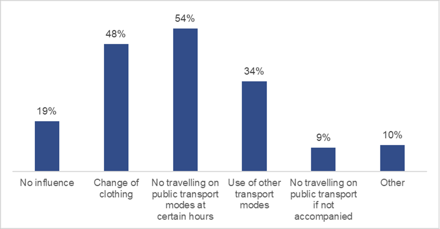 Whether it’s their perception of assault and harassment or based on previous experiences or common threats, both affect the behaviour of women, for instance, by limiting their overall use at late hours or changing their desired clothing and overall appearance. The fear of being victimized is a hurdle for female users when it comes to safely accessing public transportation.